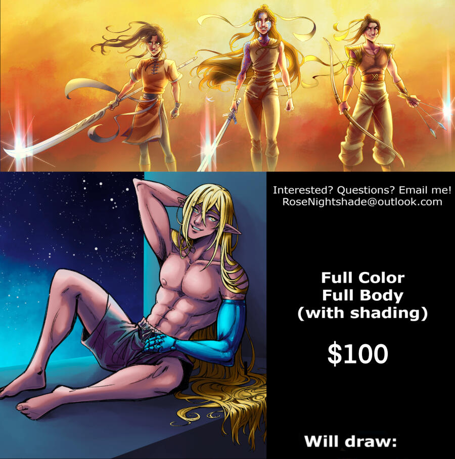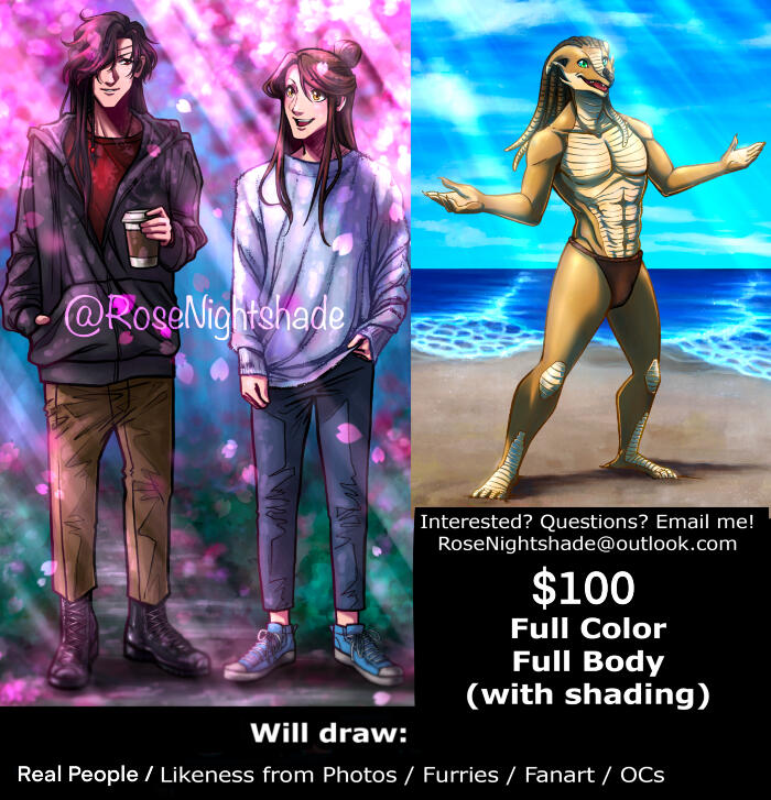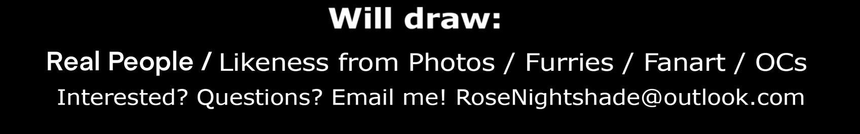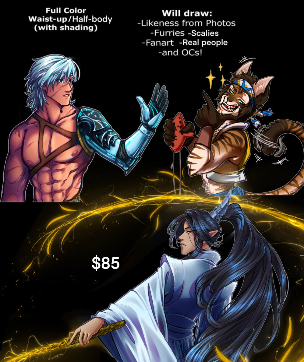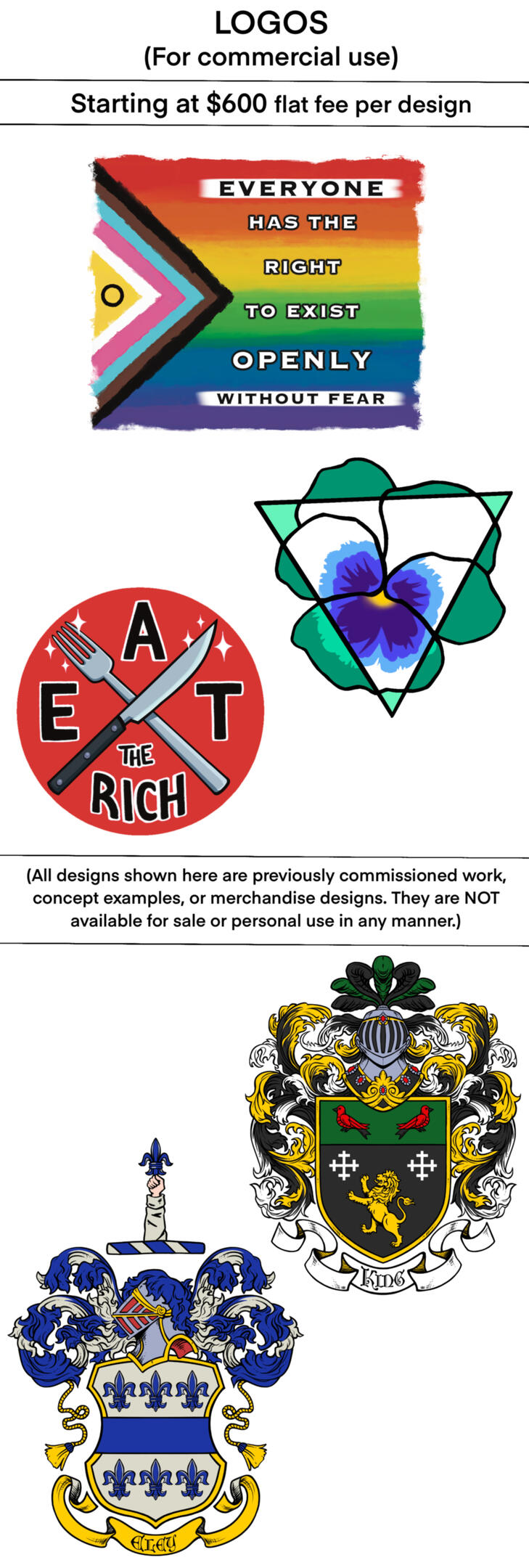 -All prices listed are in USD.-Payment is via Paypal Goods & Services Invoice only.-You will be sent an invoice which must be paid in full before I will start work on your commission. (Custom logo-work can be paid in two installments, half up front, half when the work is completed.)-All prices listed are base prices and may vary based on complexity.WILL DRAW: Original Logos, Humans, furries, scallies, real people, OCs, fanart, DnD characters, any gender, any species!WONT DRAW: Complex mechanical elements, lots of horror/gore elements.-Digital commissions: You will receive a high-res image.-Real Media commissions: Will be shipped to you. Badges will be laminated. The image will also be scanned prior to mailing and you will also receive a hi-res scan.